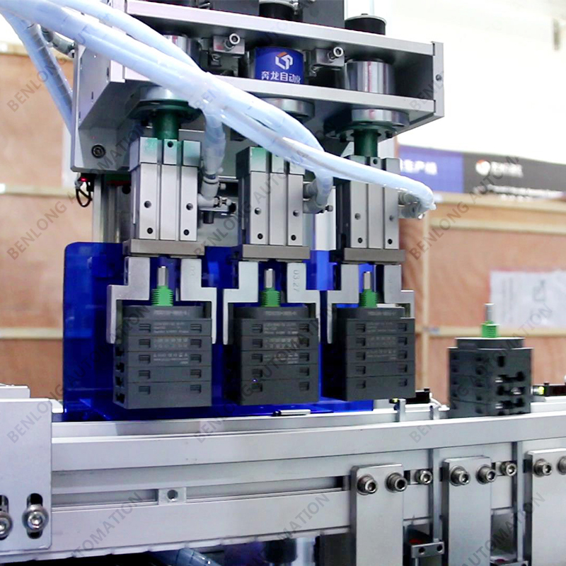 具有产品机器人自动上料、动触架装配、静触片锁螺丝、底座基座压装磁铁、左基座组件装配、右基座组件