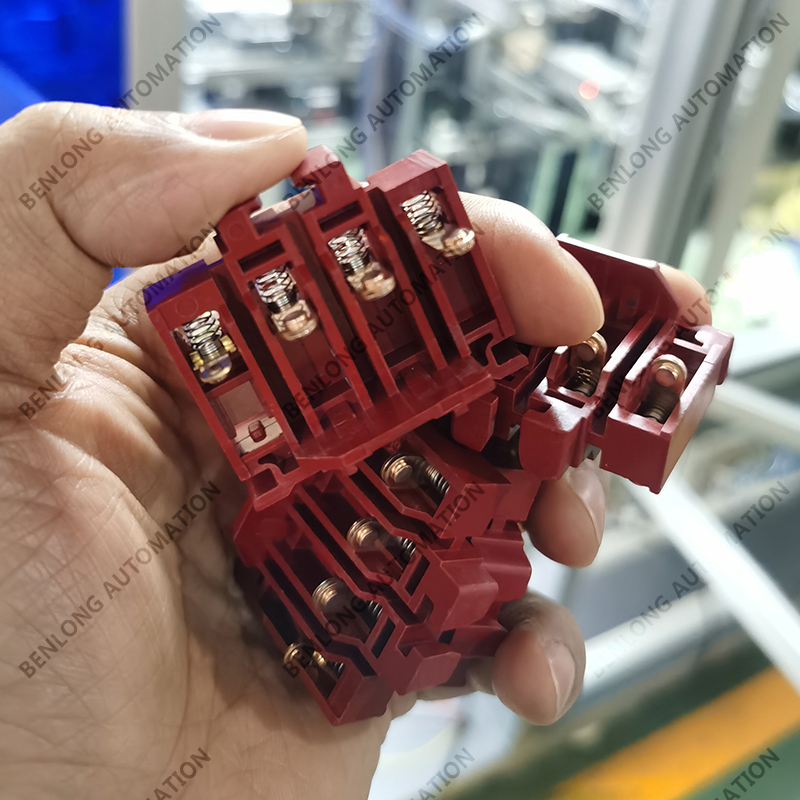 具有自动上料、插芯装配、底座装配、主辅静触头装配、人工装配宝塔弹簧、锁上下盖螺丝、锁瓦片螺丝、通断、耐压、功耗、